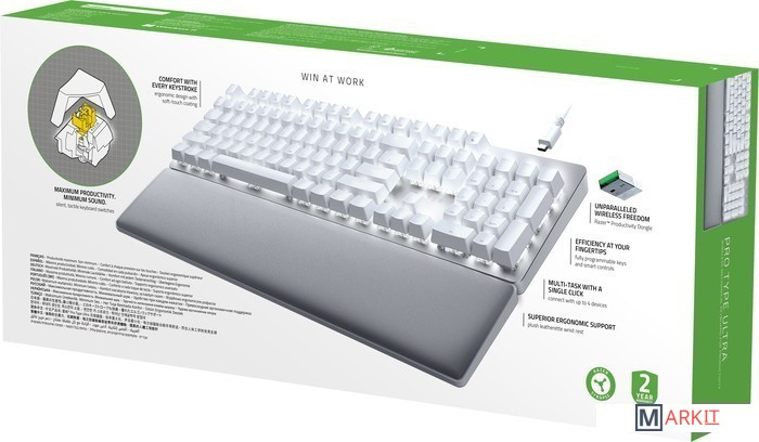 - клавиатура;- подставка под запястье;- кабель для зарядки/проводного подключения;- USB передатчик;- документация. |