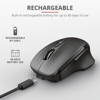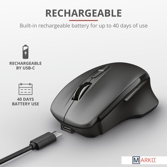 Эргономичная мышь со встроенным перезаряжаемым аккумулятором. Встроенный перезаряжаемый аккумулятор (до 40 дней работы).